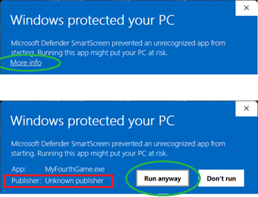 Extract the zip to any folder then launch "MyFourthGame.exe" and click "More info" then "Run anyway" if the Windows SmartScreen popup appears (and it should!)